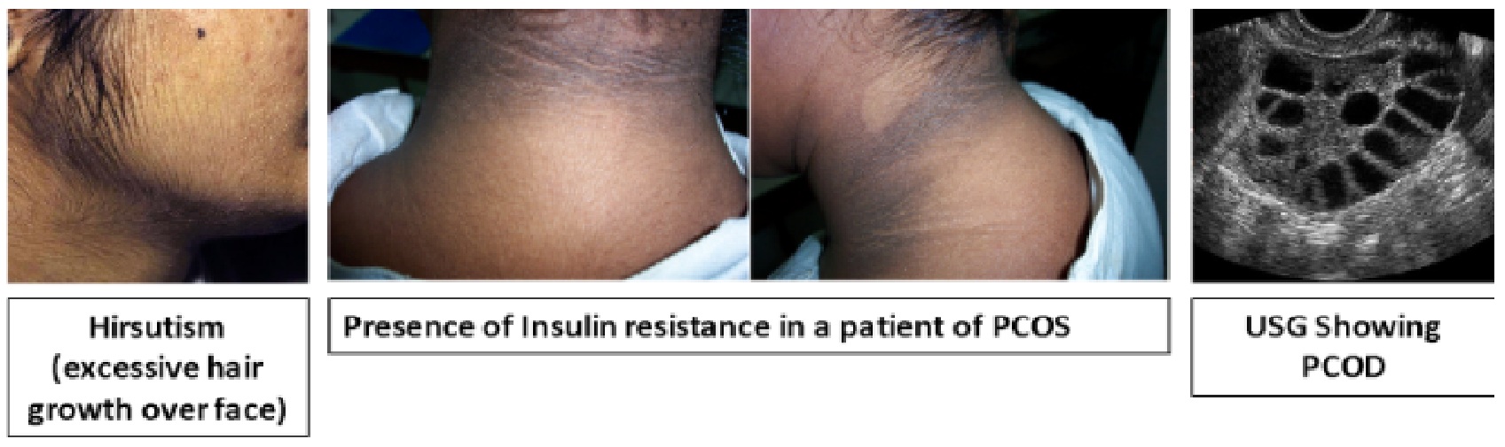 The signs and symptoms include having: Irregular menstrual periods, which means having your period more than once a month or every few months, or never having your period Periods that are very heavy or very light Unwanted hair growth on your face, chest, back, hands, upper arms and legs, or around your nipples Acne Thinner hair on your head Patches of dark, thickened skin on your neck, armpits, or between your breasts Weight problems Teens and women with PCOS also are at higher risk for type 2 diabetes, high blood pressure, and/or high cholesterol.